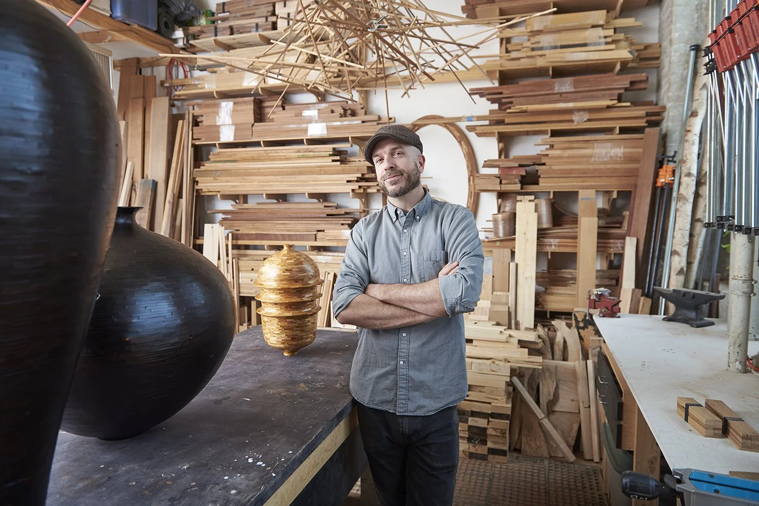 He finds inspiration in the abundance of wood being discarded throughout NYC, from wood shop offcuts to old growth lumber scrapped from the pre-war buildings of NYC's architectural landscape. This “waste” becomes his building block, calling into question what qualifies as valuable.