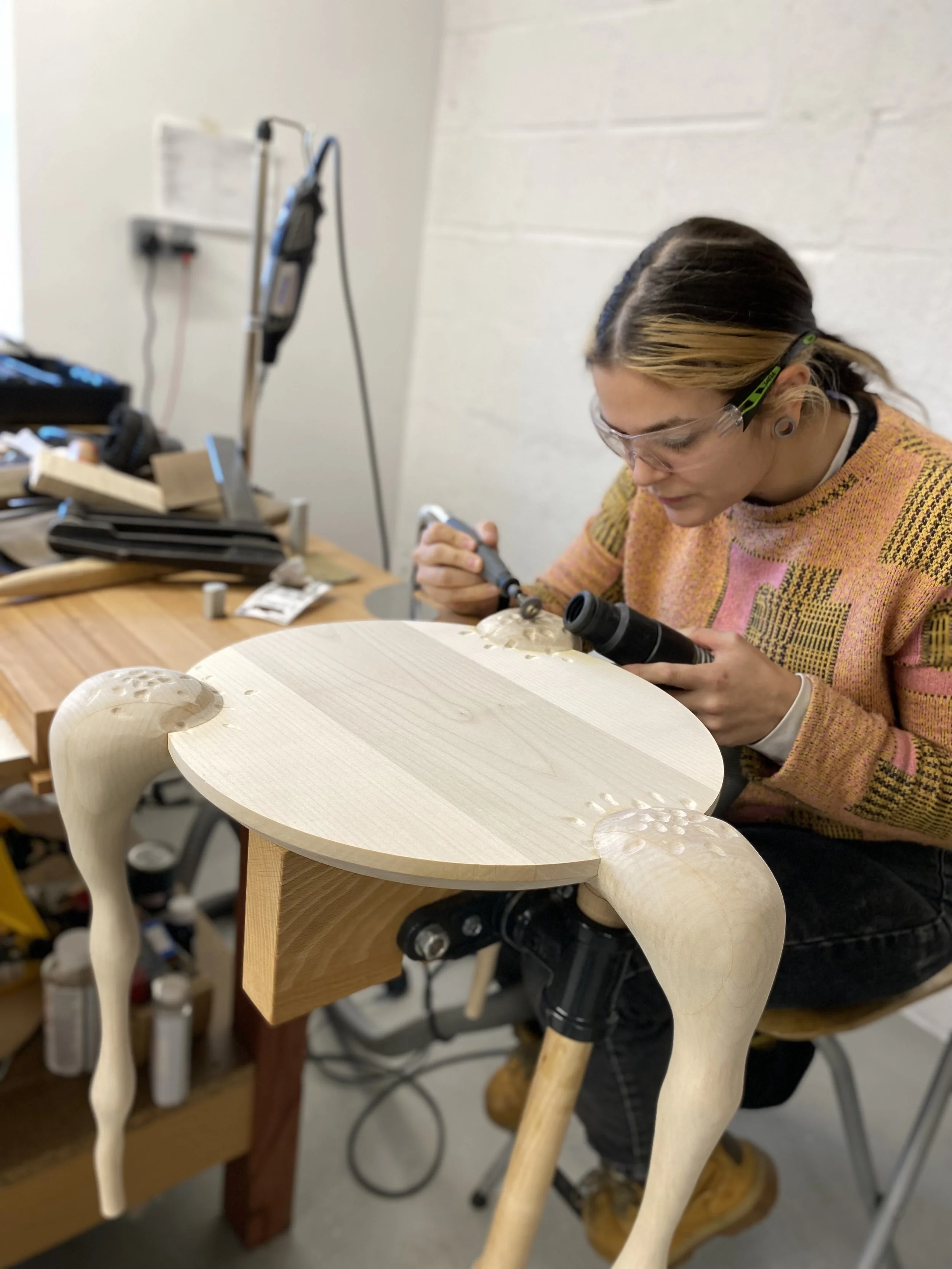 Sofia's carving process is very organic, working with power carving tools such as angle grinders, down to finer hand tools, referencing sketches throughout. This allows her to create the forms intuitively, and react to the wood as it reacts to the processes and allow the grain to inform the shape. Sofia subjects her work to extreme conditions when finishing; chemical bleaching Sycamore to achieve a bone white colour, and scorching Ash to create a blackened, highly textured finish. Working in this way allows the forms to be material led. As she carves, Sofia exposesand focuses on the natural grain in the wood, using this to inform and accentuate the shape. She wants to evoke the feeling that these pieces were once living, appearing to come from one piece by allowing the grain to inform the shape.
